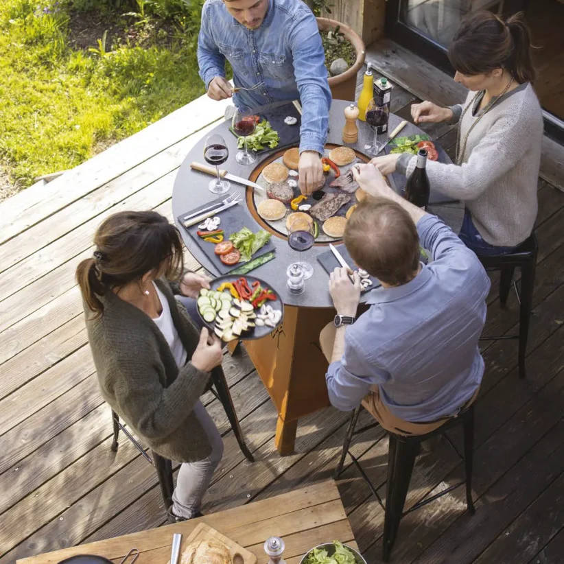 Cuisiner à l’extérieur, qu’il s’agisse d’un barbacue d’été ou d’un repas au brasero en hiver, offre une palette de saveurs et d’expériences inégalées. L’utilisation de charbon de bois ou de gaz transforme la simple préparation des aliments en un véritable art culinaire. La cuisson au feu de bois, par exemple, confère une saveur fumée riche, qui améliore le goût des viandes, légumes, et même des desserts, créant ainsi des plats mémorables. Le modèle Fusion, avec sa conception réversible, est particulièrement adapté à ces diverses méthodes de cuisson, permettant une polyvalence inégalée.